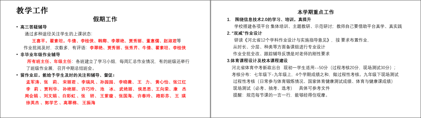 趙校長對寒假期間堅持做好防疫工作、家校溝通工作的年級主任進行表揚,也對假期放棄休息時間,連續(xù)加班準備“國家體育后備人才基地”認定材料的老師們給予了肯定。對畢業(yè)班教師在寒假期間給學(xué)生答疑輔導(dǎo)、作業(yè)批閱、非畢業(yè)班教師假期關(guān)注學(xué)生學(xué)習(xí)情況等給予了大會表揚。同時,強調(diào)本學(xué)期以信息技術(shù)2.0為契機進行能力提升是教師專業(yè)素質(zhì)完善的入手點,通過集體培訓(xùn)、主題教研、示范研討,借助平臺做真學(xué)問,有真提升,出真業(yè)績。根據(jù)“雙減”政策對作業(yè)的布置從時長、分層、種類等方面進行專業(yè)設(shè)計;及時關(guān)注河北省體育中考出臺的新政策,樹立健康第一的意識,通過教學(xué)研討及實踐,切實提升并加強學(xué)生的身體素質(zhì)和運動能力。